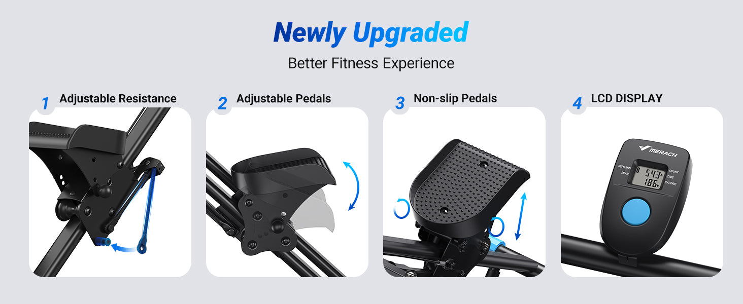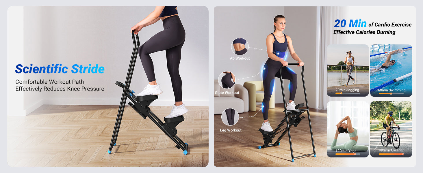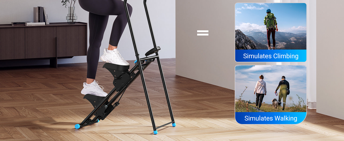 Adjustable foot pedals accommodate different user heights and stepping preferences. The reinforced frame supports up to 300 lbs, while non-slip pedals and secure handlebars provide added stability during use.