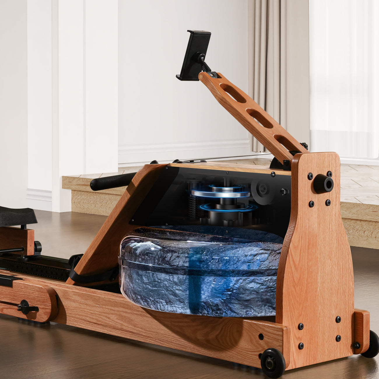 The rower is crafted with natural oak, offering both durability and a refined appearance. The wood grain adds visual warmth, and the sturdy build is designed to support stable use over time.